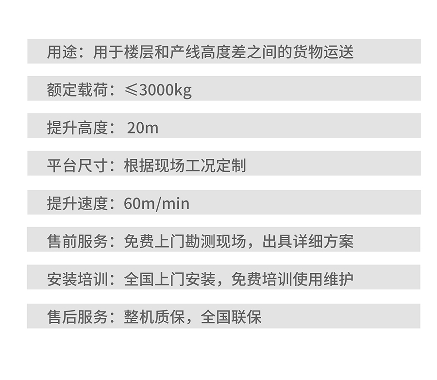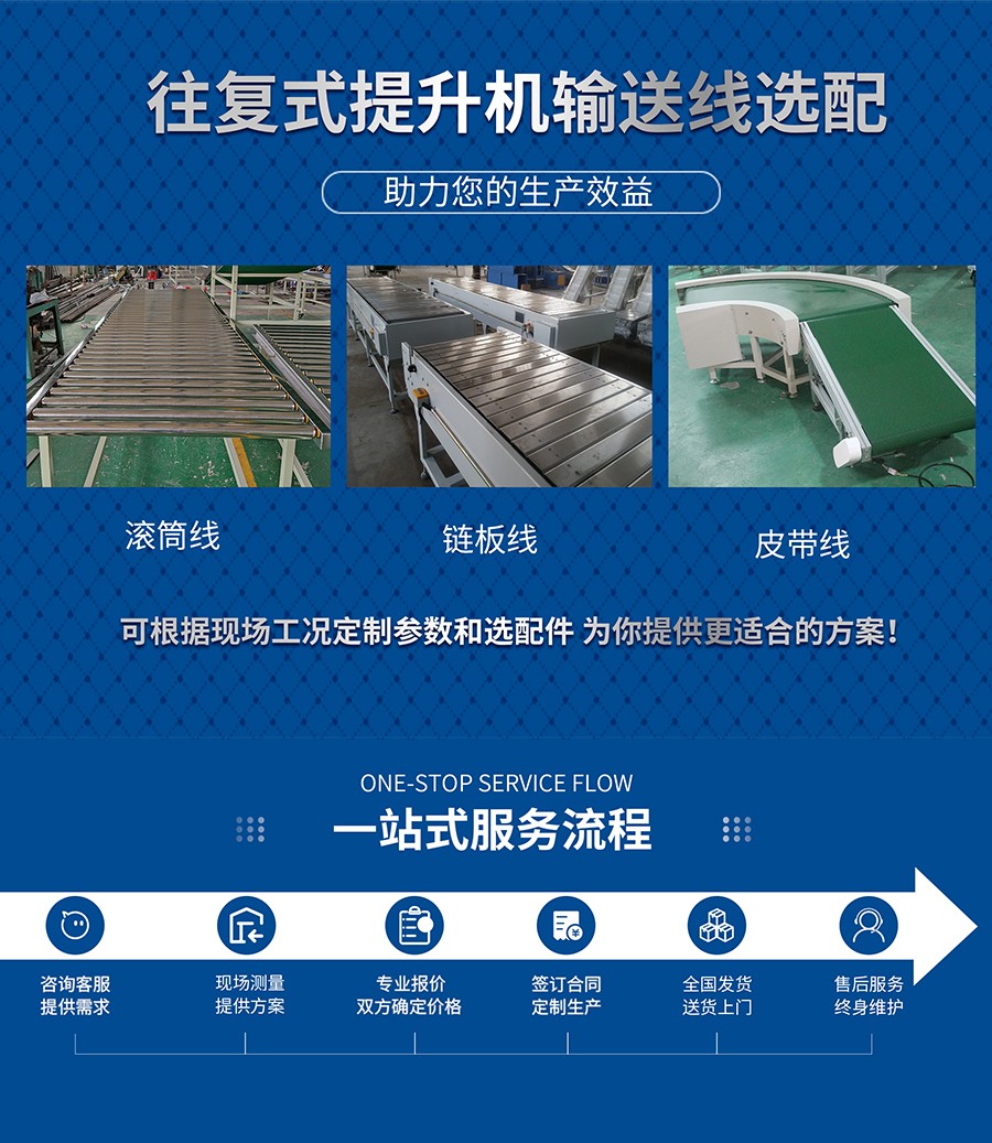 往復(fù)式提升機(jī)是由鏈條帶動(dòng),通過變頻調(diào)速控制電機(jī),便提升轎廂上下往復(fù)運(yùn)動(dòng).提升轎廂上配有傳動(dòng)機(jī)構(gòu),以便被輸送物自動(dòng)進(jìn)入升降機(jī)的提升轎廂上。該類提升機(jī)具有控制先進(jìn),性能可靠,提升轎廂定位精度高等特點(diǎn)。